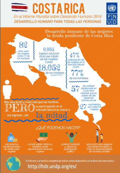 Infografía sobre la situación de Costa Rica con respecto al IDH 2016. Panorama General, Informe sobre Desarrollo Humano 2016. PNUD
