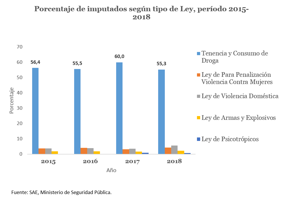 Para el tema de drogas, se considera por un lado, Tenencia y Consumo de Droga (preventiva) y por otro, Ley de Psicotrópicos, esta última considera hallazgo, fabricación, tráfico, transporte, venta y legitimación de capitales.